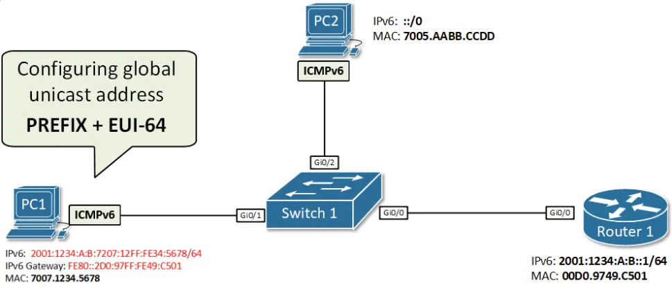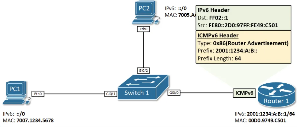 PC1이 Router 1으로부터 라우터 광고(Router Advertisement, RA)를 받은 후, 접두어 2001:1234:A:B::/64와 자신의 EUI-64 인터페이스 식별자(7207:12FF:FE34:5678)를 결합하여 글로벌 유니캐스트 주소 2001:1234:A:B:7207:12FF:FE34:5678/64를 생성한다. 라우터 광고가 Router 1에서 왔기 때문에, PC1은 IPv6 기본 게이트웨이를 Router 1의 링크 로컬 주소로 설정한다.