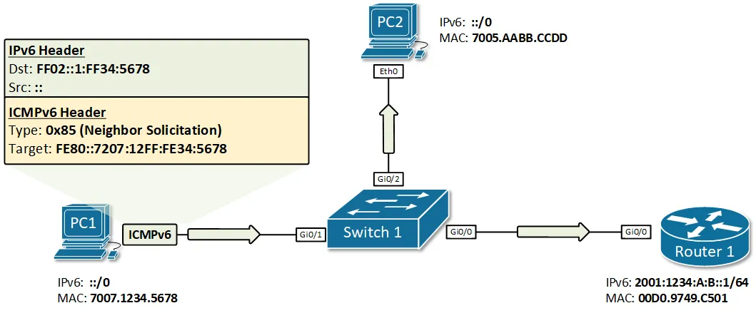 PC1이 링크 로컬 주소를 가진 후, 이제 SLAAC를 사용하여 글로벌 유니캐스트 주소를 자동으로 구성하는 과정을 시작할 수 있다. 이 과정의 첫 번째 단계는 라우터 요청(Router Solicitation, RS)이라고 불리는 ICMPv6 메시지를 전송하는 것이다. 이 메시지의 목적은 이 세그먼트에 연결된 모든 IPv6 라우터에게 사용 중인 글로벌 유니캐스트 접두어에 대해 '요청'하는 것이다. 목적지 주소는 모든 라우터를 위한 멀티캐스트 주소 FF02::2이며, 출발지 주소는 PC1의 링크 로컬 주소를 사용한다. FF02::2 멀티캐스트 그룹에 가입된 노드는 라우터만 있기 때문에, 이 메시지는 오직 라우터 1만 처리하고, 로컬 세그먼트의 다른 모든 노드는 이를 폐기한다.